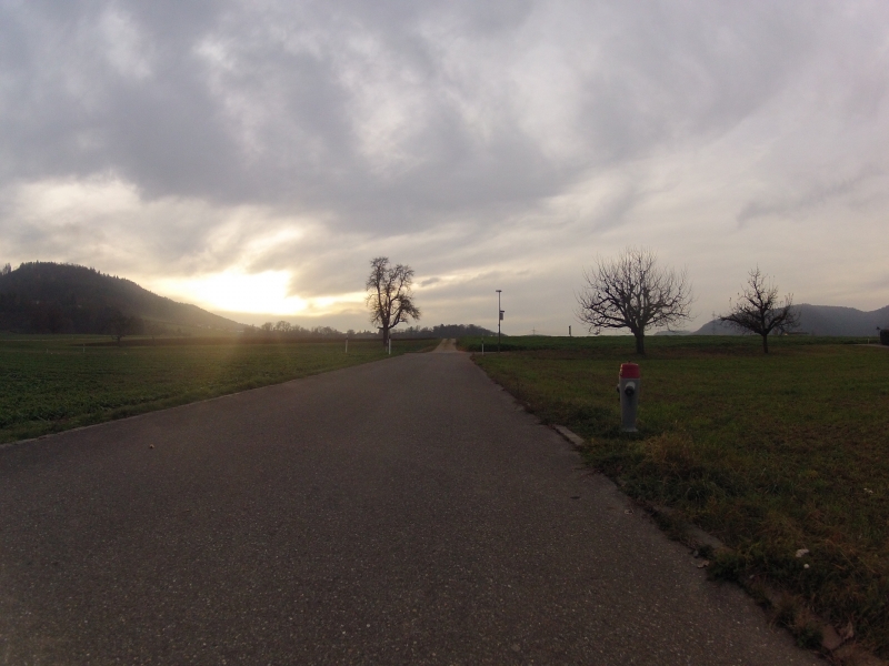 Es war schon Nachmittag, die ersten und einzigen Sonnenstrahlen setzten sich gerade gegen den Hochnebel durch, als ich mich auf den Renner setzte. Nach der gestrigen, eher flachen Fahrt, wollte ich heute eher Höhenmeter kurbeln. Dazu eignen sich ja unsere Hausberge rundherum bestens.