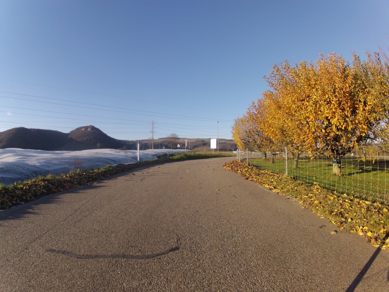 Knapp vor der Passhöhe bog ich rechts ab, nochmals kurz ins Gegenlicht, bevor sich die Strasse hinunter ins Fricktal neigte. Auch der Aufstieg auf den Bözberg befand sich jetzt schon im Schatten.