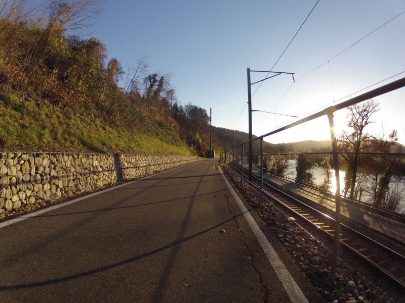 Weiter ging es hinunter, dem Rhein entlang, bis zur nächsten Abzweigung, hinauf zur Ampferenhöhe. Der Sonnenstand bereits wieder so tief, dass das ganze Tal im Schatten lag. Die Windverhältnisse waren sehr merkwürdig. Manchmal wurde ich ein bisschen geschoben, oft aber blies mir die Bise direkt ins Gesicht.