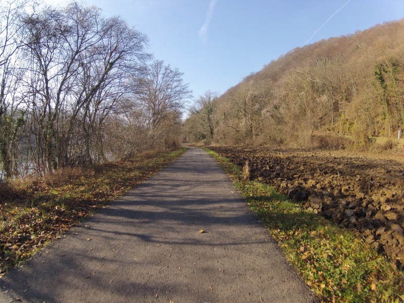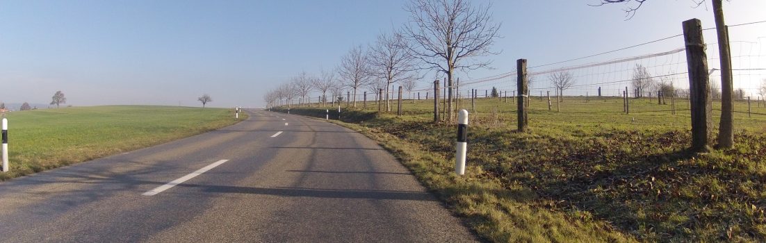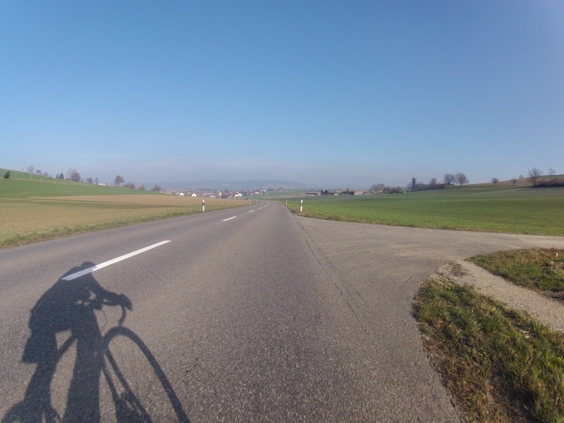 Die Absicht war einzig und alleine die, möglichst viel an der Sonne zurückzufahren. Während nämlich auf der Schweizerseite die Strasse oft zwischen den Hügeln und dem Rhein eingeklemmt ist, jetzt bei diesem tiefen Sonnenstand auch oft im Schatten liegt, hoffte ich am Südfuss der Deutschen Hügel auf Sonne. Diese Überlegung ging bestens auf. “Schade” war, dass der Wind die Richtung gekehrt hatte. Schob er vorhin das Surbtal hinauf, hatte ich jetzt Gegenwind. Aber es war erträglich und zusammen mit der Sonne doch nicht allzu kalt.