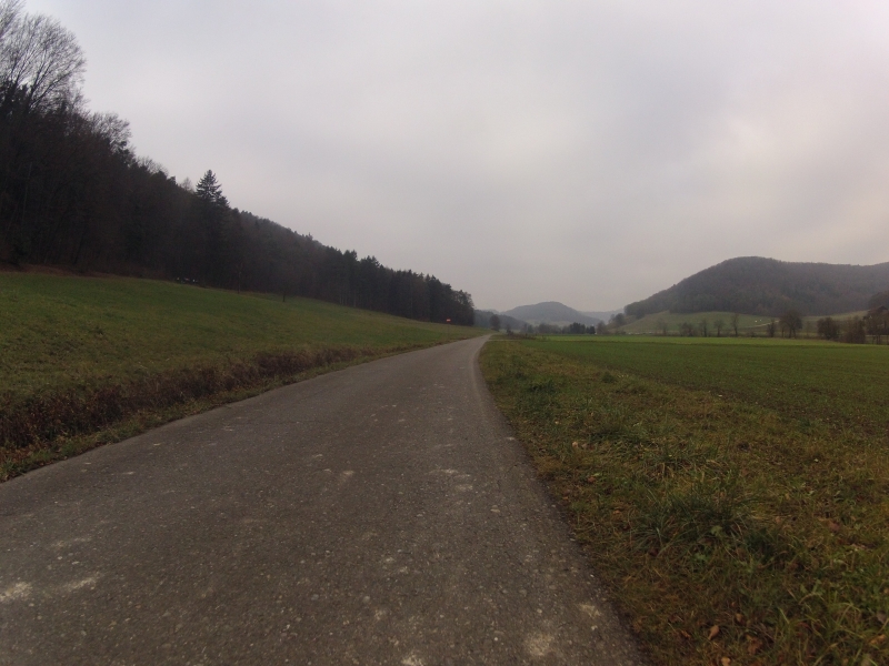 Danach dauerte es aber noch bis Bad Zurzach, bis tatsächlich auch die ersten Sonnenstrahlen den Weg auf die Strasse herunter fanden. Bald nach Bad Zurzach, in Mellikon, musste ich dann allerdings schon wieder an den Heimweg denken. Meine Fahrt das Tal hinauf über Wislikofen nach Niederweningen im Surbtal führte schon bald wieder zurück unter den Nebel, oder wenigstens unter eine zähe, dicke Dunstschicht. Doch meine Kamera am Lenker benützte die Gelegenheit und schoss reihenweise recht gute Schnappschüsse. Gegenlicht und Dunst über gar manchen Kilometer.