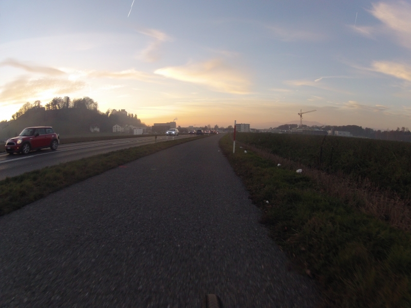 Für die heutige Runde fuhr ich wiederum ein Stück das Reusstal hinauf bis nach Birrhard. Die Sonne stand schon wieder recht tief über der Gegend. Ich hoffte darauf, dass die Kamera am Lenker wieder ein paar brauchbare Bildchen mit herbstlicher Stimmung schiessen würde.