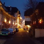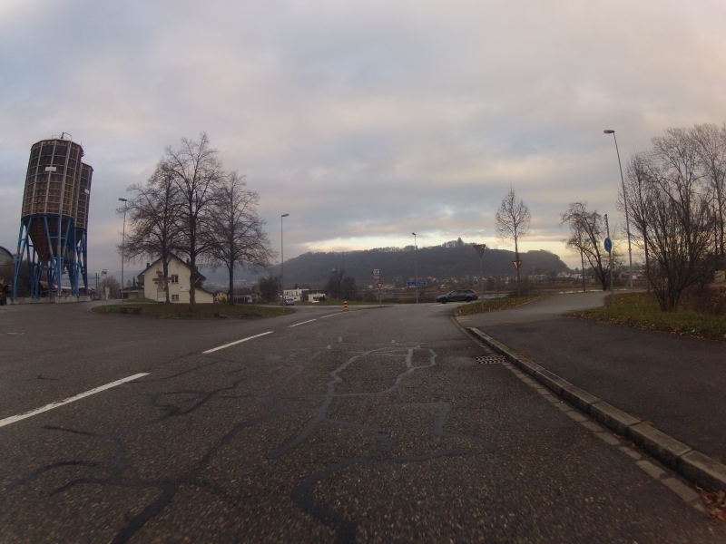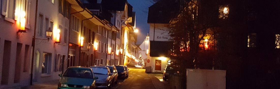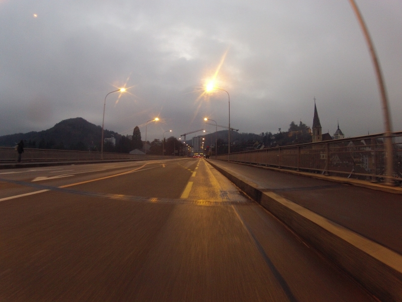 In Döttingen verliess ich das Aaretal, fuhr links weg das Surbtal hinauf. Mit der langsam hereinbrechenden Dunkelheit zündeten sich da und dort die Weihnachtsbeleuchtungen an. In Ehrendingen nahm ich das Höhtal als Übergang nach Baden hinunter. Am höchsten Punkt hielt das Wetter für einen kurzen Moment ein feuerrotes Abendrot bereit. Leider allerdings viel zu schmal, als dass das eine besonders schöne Aufnahme gegeben hätten. Wenig später überrollte ich dann auf dem Weg hinüber nach Dättwil und Mellingen bereits die Hochbrücke in Baden.