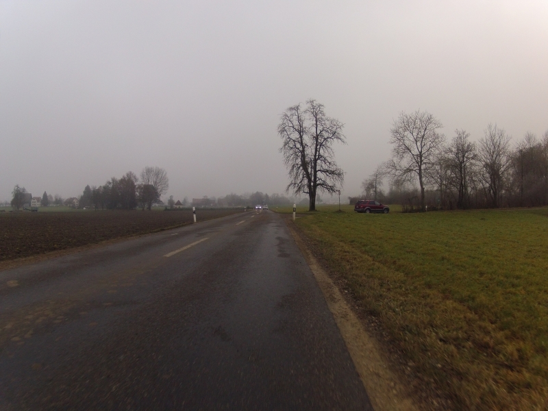 Ich fuhr eine Weile durch das Reusstal hinauf, versuchte dann mein Glück im Bünztal. In Villmergen fuhr ich auf dem ehemaligen Bahntrasse der Wohlen – Meisterschwanden – Bahn nach Sarmenstorf hinauf und wechselte so hinüber ins Seetal. Eine Weile lang fuhr ich offensichtlich entlang der Gefrierzone. Das Gebüsch entlang der Strasse war ziemlich nass, einzelne Gräser waren vom Frost noch weiss.