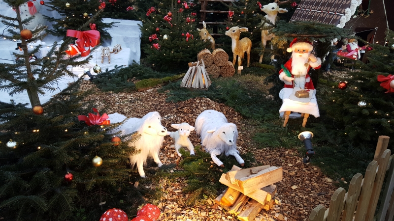 Auf einer eigenen Wiese sind da einige Christbäume mit allerlei Tieren und Samichläusen aufgestellt. Einige erzählen Geschichten, dazu nicken die Tiere dann fleissig. Ein anderer Samichlaus ist wohl von seinen Besuchen in den Familien ziemlich mitgenommen und schläft und schnarcht unüberhörbar neben seinem kleinen Häuschen.