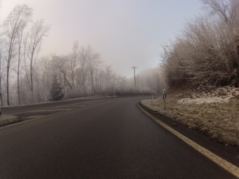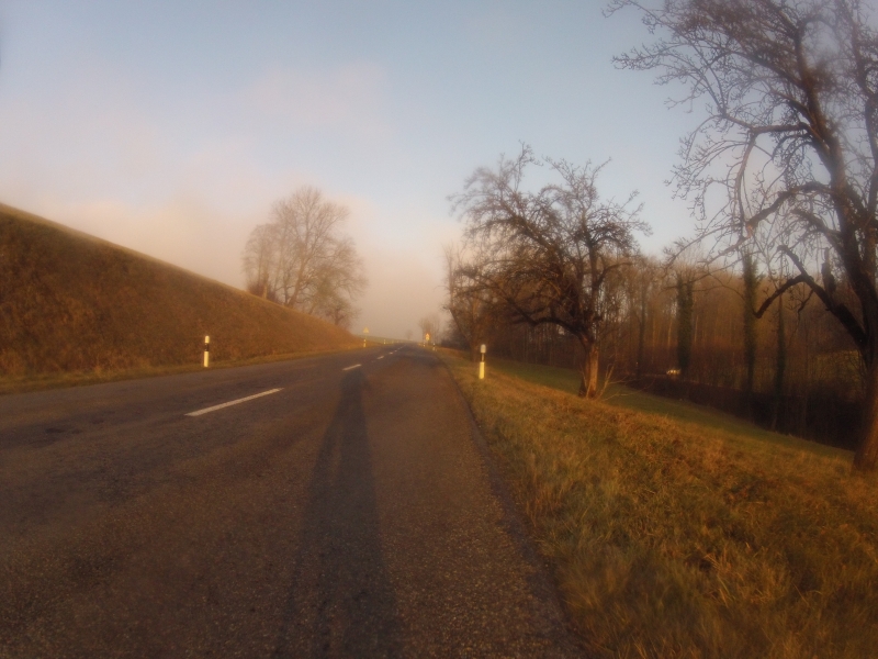 Es geht heute nochmals am Kieswerk von Eiken vorbei nach Kaisten, mehr oder weniger dem Rhein entlang bis Etzgen und dann nochmals das ganze Mettauertal hinauf bis auf den Rotberg. Unterwegs wurde es langsam dunkel. Auf dem Rotberg liegt auch der Nebel wieder auf der Strasse.