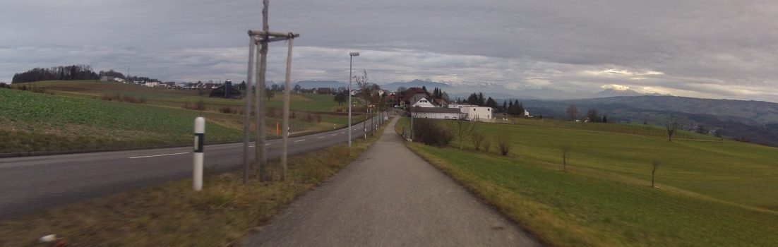 Danach geht die Strasse in der Höhe noch etwas weiter, bevor sie sich nach Oberwil hinunter ins Reusstal stürzt. Während der Abfahrt gelang der Kamera am Lenker noch ein kleiner Schnappschuss mit Blick bis zum fernen Alpenkamm.
