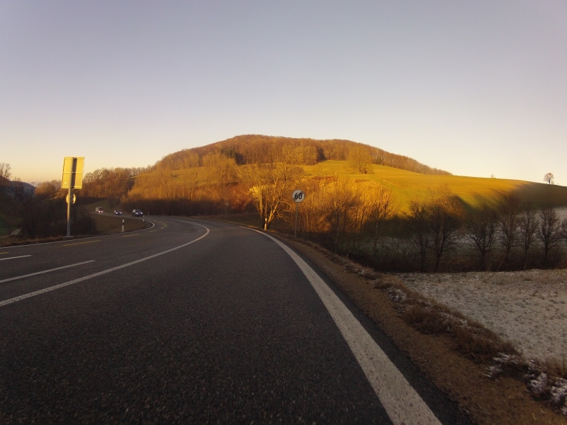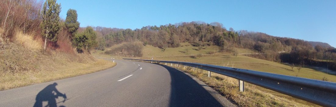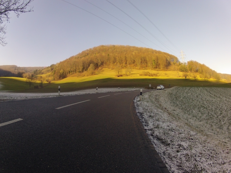 Die Passhöhe liegt zwischen anderen Hügeln bereits wieder im Schatten. Die Abfahrt nach Küttigen kann ich teilweise an der Sonne, teilweise am Schatten fahren. Die Bise hält sich zwar zurück, kalt ist es aber trotzdem.