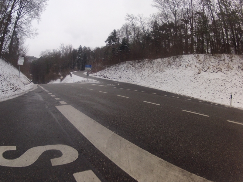 Aus dem Aaretal hinauf auf das Villigerfeld. Diesmal weiter auf verschneiten, aber nicht vereisten, Radwegen nach Mönthal und schlussendlich auf die Bürensteig.