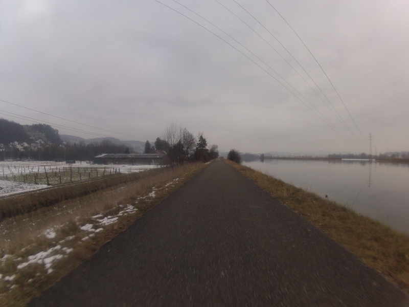 Danach links, das ganze Tal hinunter bis an den Rhein. Immer kurbelnd mit leichtem Druck auf der Pedale, damit die Heizung in den Beinen auch immer schön für ein bisschen Wärme sorgt. Am Rhein angekommen, geht es dann rechts, mehr oder weniger in der Nähe des Rheins aufwärts, bis zur Aaremündung. Eine Strecke ohne grosse Steigung, durchgehend mit Radstreifen markiert. Fahre ich noch gerne, jetzt im Winter unter dieser grauen Nebeldecke, nur mit den Farben Weiss und Braun/Dunkelbraun, vielleicht etwas langweilig. Nach Leibstadt fahre ich noch einen kleinen Schwenker nach Full, gibt ein bisschen Abwechslung zur Eintönigkeit der Hauptstrasse.
