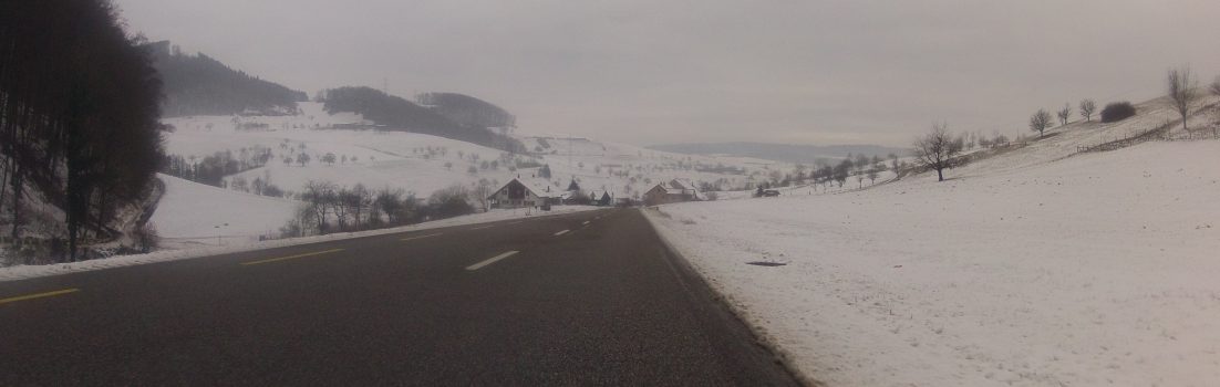 Aus dem Aaretal hinauf auf das Villigerfeld. Diesmal weiter auf verschneiten, aber nicht vereisten, Radwegen nach Mönthal und schlussendlich auf die Bürensteig.