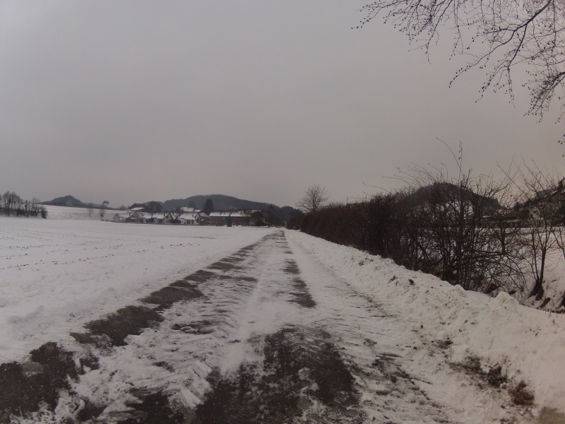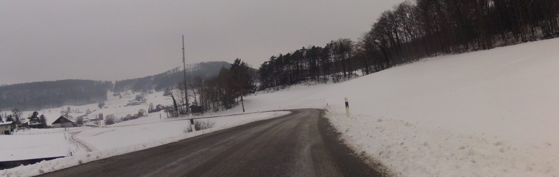 Nach der Ampferenhöhe musste ich noch über den Bözberg wieder zurück ins Aaretal. Leider gibt es von da kein Bildchen mehr, weil auf der Linse der Kamera am Lenker Schmutz festfror. Dieser “simuliert” dann eine total trübe Stimmung im Aaretal. Wir hatten zwar Hochnebel, aber immerhin keinen Bodennebel.