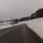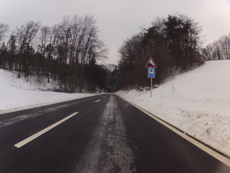 Die meisten Strassen sind mittlerweile ganz trocken. Weiss ist meist nur noch das eingetrocknete Salz darauf. Aber einzelne, eher kleinere Strassen sind immer noch nass und dürften vermutlich bei diesen Temperaturen auch vereiste Stellen aufweisen. So war ich dann ganz froh, dass mich während der Auffahrt auf die Ampferenhöhe, der Salzstreuer vom Strassendienst überholte. Jedenfalls beruhigte das ein bisschen für so steile Abfahrten, wie eben gerade hier.