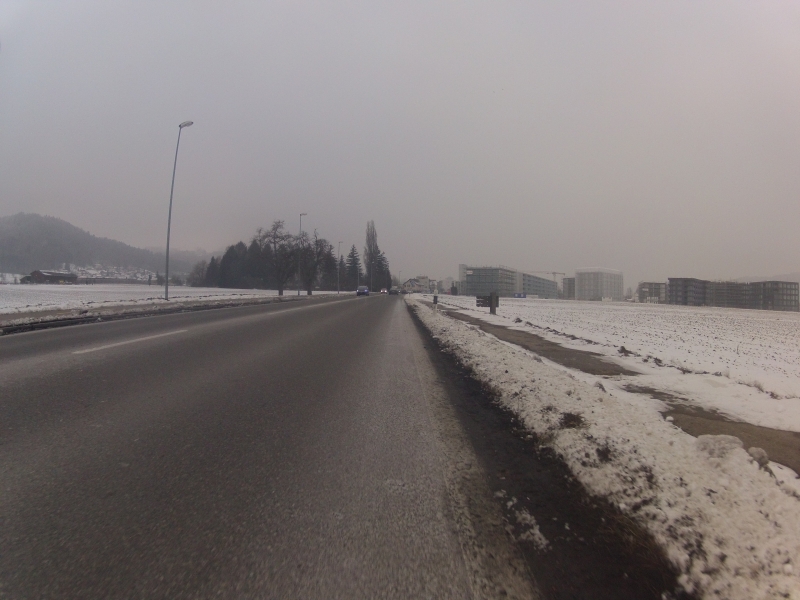 Gerade bei den Radwegen. Doch wer genau hinsieht, kann auch den (Rad-)Wegweiser erkennen, der zum rechten Bildrand zeigt. Es lagen dann doch noch ein paar Meter festgefahrener Schnee und Eis auf der Strasse, doch es hielt sich in Grenzen und war mit meinen profilierten Pneus eigentlich kein Problem, wenigstens bei angepasster Fahrweise.