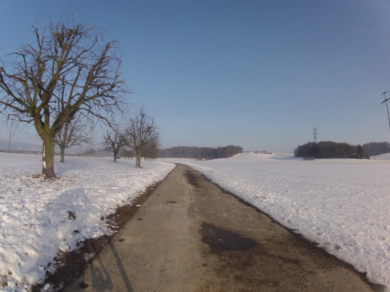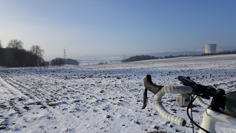Ich umfuhr via Böttstein, Leuggern, Leibstadt, Full und Koblenz grossräumig die Aaremündung bevor ich nach Bad Zurzach hinüber radelte. Weil die Sonne jetzt im Januar immer noch relativ tief unten steht, reichten die Sonnenstrahlen auf dem Teil zwischen Koblenz und Bad Zurzach, fast nirgends bis an den Rhein, beziehungsweise auf den Radweg. Zu hoch sind die umliegenden Hügel. Hätte ich daran gedacht, wäre die deutsche Seite des Rheins sicherlich die, mit mehr Sonne gewesen.