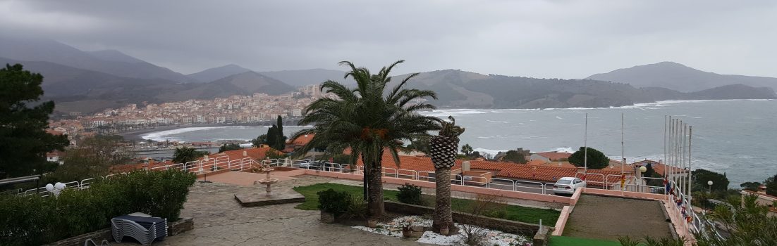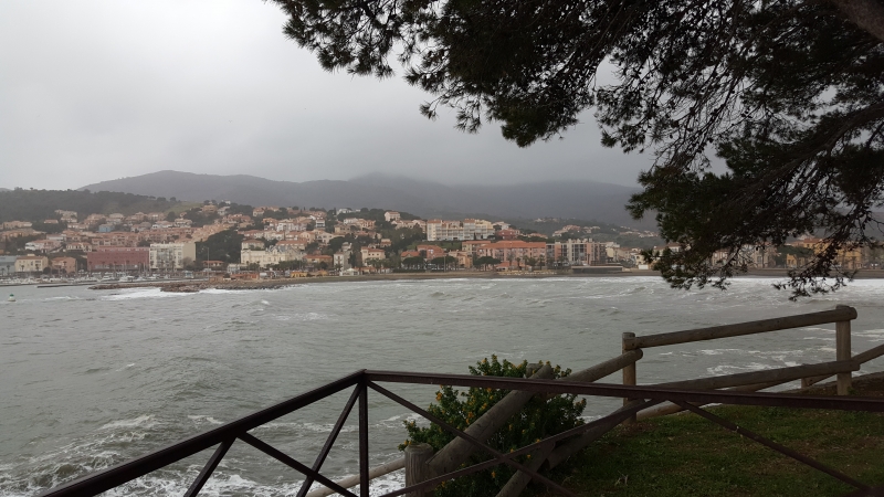 Ich schlendere um die Bucht von Banyuls-sur-Meer. Das eine oder andere Bistro oder “Tabac” hat tatsächlich geöffnet. Hinter den vom Salzwasser verklebten und angelaufenen Fensterscheiben sitzen ein paar Einheimische, warten dort wohl auf besseres Wetter. Die Gassen sind leer. Die paar wenigen Touristen haben einen Regenschirm dabei, denn es ist auch heute wieder rundherum furchterregend schwarz und dunkel. Vermutlich regnet es nur an den Hügeln. Der kräftige Wind weht die Wolken rasch ins Landesinnere.