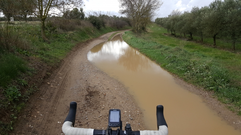 Irgend einmal brachte mich der violette Strich am Navi doch wieder auf eine befestigte Strasse. Am nächsten Kreisel die Angabe, dass es bis Girona, meinem heutigen Etappenziel, noch 21 Kilometer seien. Das GPS lockte mich bald wieder durch ein kleines Dorf, weg von der grossen Strasse. Doch als dieser Weg hinter dem Friedhof wieder unbefestigt war, und mit einer Wasserlache anfing, war für mich der Fall klar: “alles schon gesehen, alles schon erlebt”. Ich kehrte zurück zum Kreisel und für die restlichen gut 20 Kilometer auf wunderschönen, zwar hügeligen, Hauptstrassen bis vor mein Hotel.