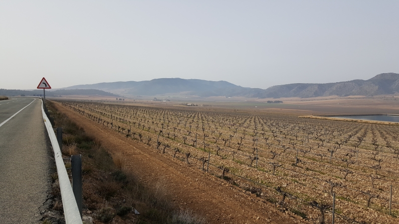 Irgendwo in dieser Gegend führt auch die Weinstrasse von Valencia und diejenige von Murcia vorbei. In der Nähe befindet sich ebenfalls die Sierra Salinas. Ich bin zwar nicht so der Weinkenner, aber die Häufigkeit der Bodegas entlang des Wegrandes, die Rebstöcke, die Hinweise auf die Sierra Salinas sind auffällig.