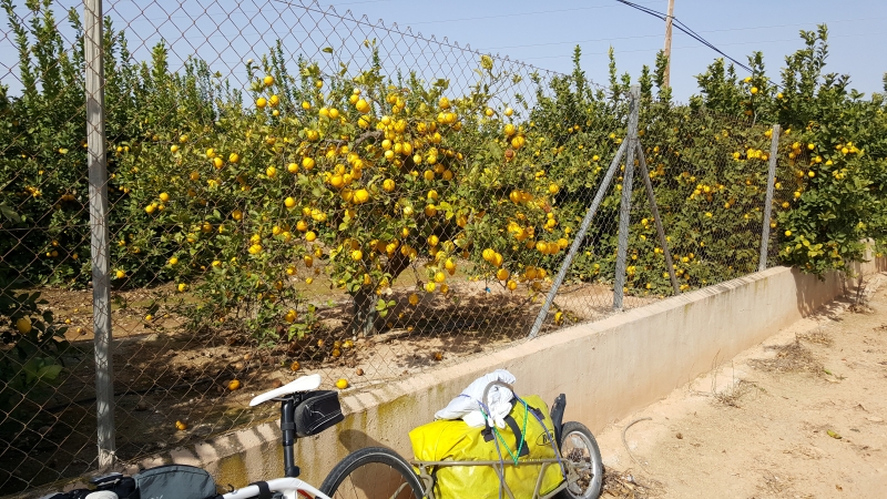 Mittlerweile hat ein Thermometer einer Apotheke bereits 25 Grad angezeigt. Der Wind trägt einen Limonen – artigen Geschmack herbei. Tatsächlich fahre ich bald durch einige Kilometer Zitronenplantagen hindurch.