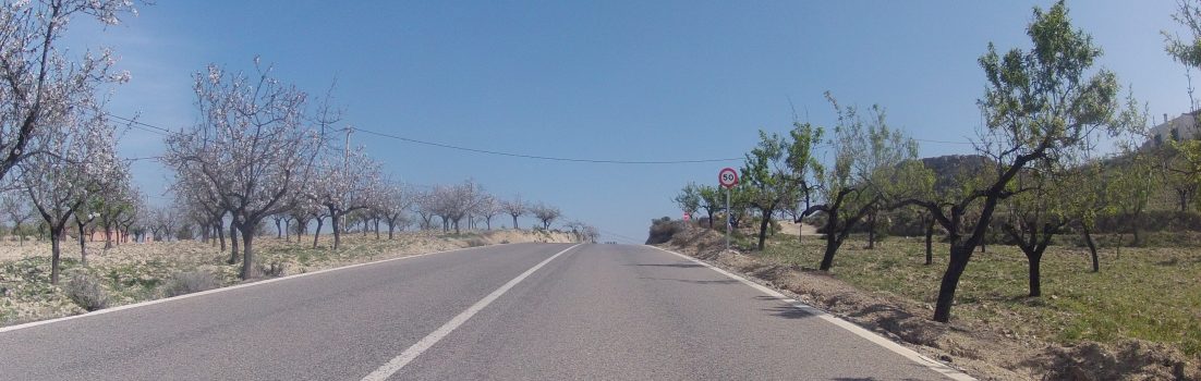 Die Bedarpasshöhe, ca 600 Meter über Meer. Linkerhand blühen die Mandelbäume noch, rechterhand sind sie bereits etwas weiter, haben die Blüten abgeworfen und ihre Blätter aus den Knospen getrieben. Die Abfahrt hinunter zum Dörfchen Bedar und weiter nach Los Gallardos rollt auch heute gut.