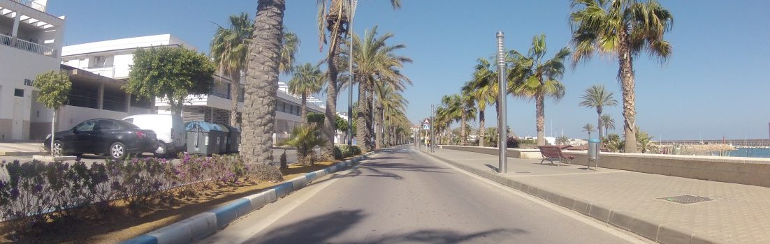 Die heutige Strecke führte schon bald vom Meer weg ins Landesinnere. Leicht ansteigend, teilweise auf der N340a, der ehemaligen Mittelmeerautobahn nach Sorbas. Heute, am Nationalfeiertag von Andalusien, hatten wir auf dem sonst rege befahrenen Cement-Trail kaum Verkehr. Kurz vor Sorbas biegen wir links weg nach Los Molinos de Rio Aguas. Ein kleines Nest von ein paar Häusern. Aus einem der Kamine entweicht tatsächlich etwas Rauch. Auf der Anhöhe halten wir einen kurzen Moment inne, geniessen den Blick hinüber zur Sierra Nevada.