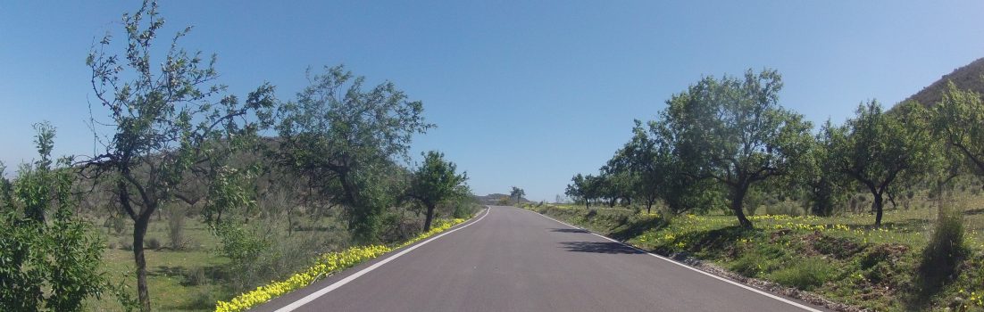 Bei aufklarendem Himmel und nachlassendem Wind setzten wir unsere Fahrt, zurück ans Meer, fort. Immer wieder bin ich überrascht, wie grün sich Andalusien diesen März präsentiert. Wenigstens im Vergleich zum letzten Jahr, ist die Vegetation viel weiter fortgeschritten. Die Mandelbäume sind nun wirklich alle verblüht, tragen sogar schon die ersten neuen Mandeln, etwa in der Grösse eines Daumens. Die Orangen sind viele schon geerntet. Heute Nachmittag sind wir an einem Feld vorbei gefahren, darauf blühten sogar schon die meisten Orangenbäume wieder. Auch viel grünes Gras und Gewächs ist zu finden und überall auch die gelben Blumen.