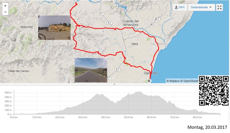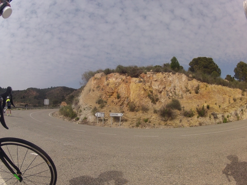 Die Strecke führt zuerst bis Palomares eine Weile dem Meer entlang nach Norden. Ideales Einrollen für die neuen Gäste. Danach zweigen wir ins Hinterland ab. Die ersten kleinen Hügel folgen, es geht ständig leicht aufwärts, ein paar kleine Hügel. Nachdem wir das Mittelmeer verlassen haben, fahren wir an unzähligen Orangenbäumen vorbei, später an den Höhlen von Cuevas del Almanzaro, bevor wir in die Orangenplantage einbiegen. Nochmals viele Orangenbäume, später 1000ende von neu gepflanzten Olivenbäumen, ein paar Mandelbäume und zum Schluss drei Kilometer Passfeeling mit Spitzkehren, und immer besser werdender Aussicht über das Gebiet bis zurück ans Meer.