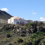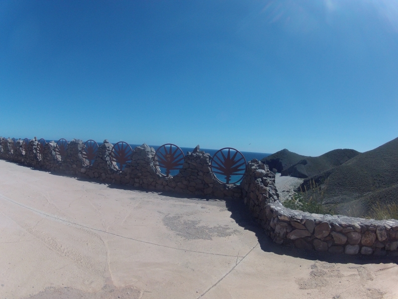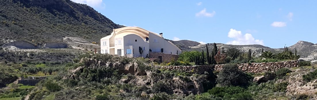Wir kämpfen uns weiter gegen den Wind durch. Ein Stück der eher rauhen Strasse der hügeligen Strecke nach Carboneras in das Hinterland ist neu asphaltiert und bemalt worden. Es rollt jetzt recht gut. Doch der Wind, mal kalt, mal warm, mal von hinten mal von vorne “verwirbelt” sich richtig in dem teils engen und zerklüfteten felsigen Abschnitt unserer Strecke. Nach einer vorerst letzten steilen Rampe, stehen wir plötzlich vor unserem markanten Wendepunkt, dem Muschelhaus.