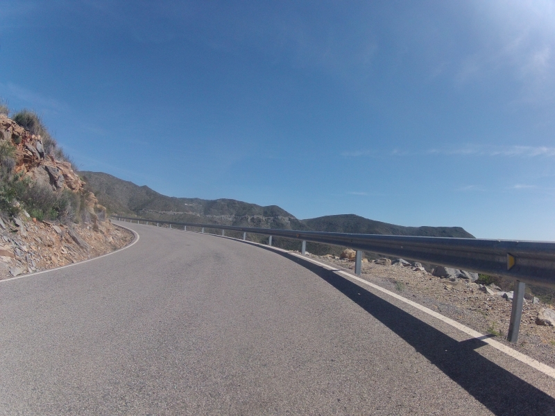 Die Auffahrt auf der südlichen Rampe besteht aus einer sehr regelmässigen Steigung. Auf gut 10 Kilometern werden etwa 500 Meter Höhen überwunden. Man hat genügend Zeit auch mal einen Blick neben die Strasse zu werfen. Am Anfang ist das die Gegend nach Sorbas und zur Sierra Alhamilla hinüber. Später, wenn die Strasse auf die hintere Seite des Berges wechselt ist das die Sicht talauswärts bis an die nächsten Bergketten hinter Albanchez und Albox.
