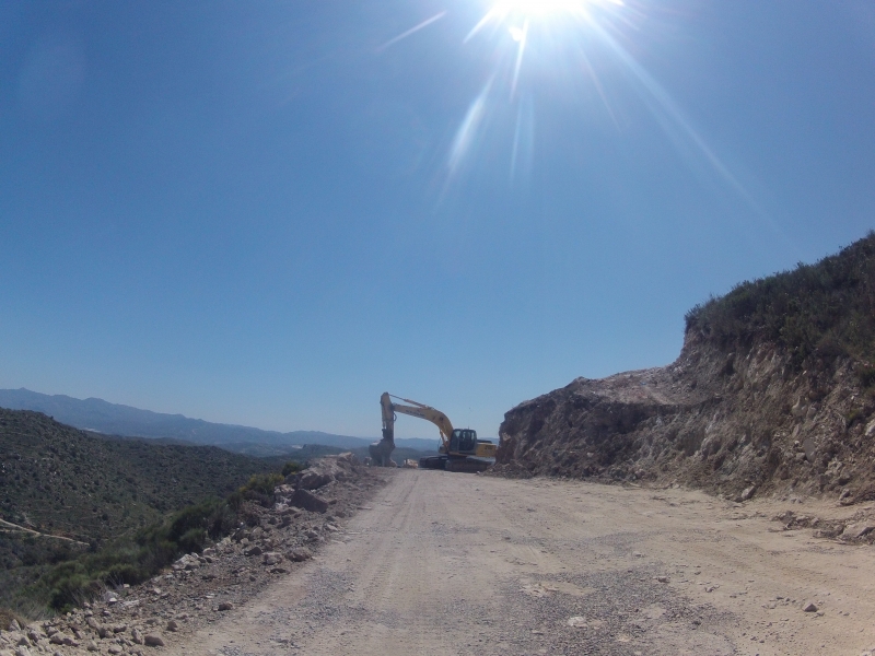 Wir fahren bis an das obere Ende der Orangenplantage, nehmen dann die Strasse nach Lubrin und weiter in Richtung El Pilar. Nach ein paar Metern Anstieg zum Pilarpässchen biegen wir ab, nach El Chive. Die Warntafeln stehen immer noch da.