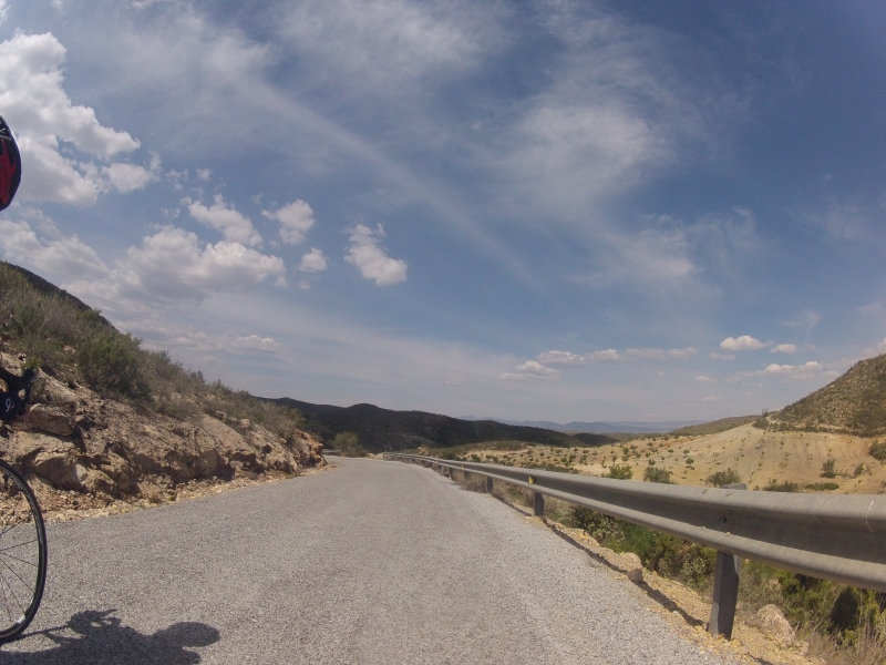 Einige Geländewellen und ein paar Spitzkehren später waren wir bereits auf dem nächsten Übergang. Wir genossen eine Abfahrt auf schönster Strasse, konnten es eine Weile lang rollen lassen. Beim nächsten Anstieg, auf einer etwas holprigen Strasse, teilweise entlang von Felswänden und anderen steilen Abhängen, da waren wir sogar um die paar schattenspenden Wolken froh. Der Wind hatte nachgelassen, die Hitze an einzelnen Stellen brachte unsere Kehlen zum Austrocknen. Auf einer etwas holprigen Strasse überqueren wir bald auch die nächste Hügelkette und schauen schon in die nächste Geländekammer.