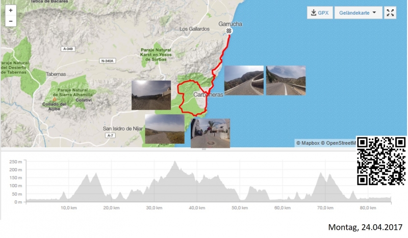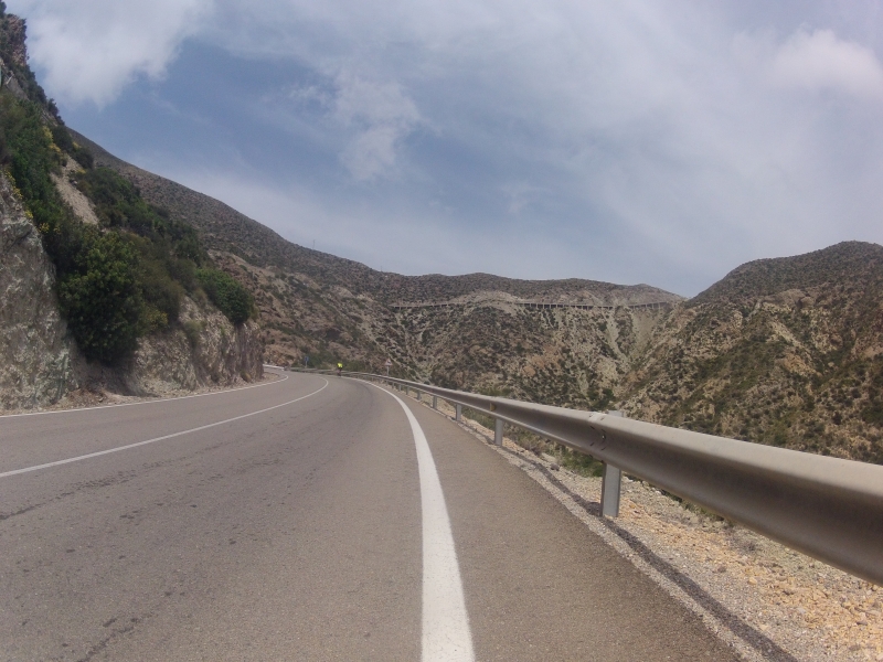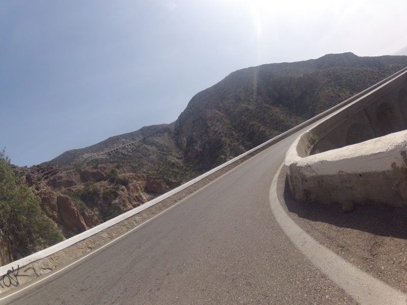 Bei wiederum schönstem, vielleicht etwas dunstigem Himmel, fuhren wir in südlicher Richtung dem Meer entlang. Den kleinen Hügel nach Mojacar, die längere Rampe nach Sopalmo hinauf und als Dritten im Bunde die Kurblerei zum vorerst höchsten Punkt dieses Tages, dem Carboneraspässchen bewältigten wir recht zügig. Die Abfahrt wieder hinunter ans Meer konnte auf den leeren, schnellen Strassen, wieder recht zügig gefahren werden.