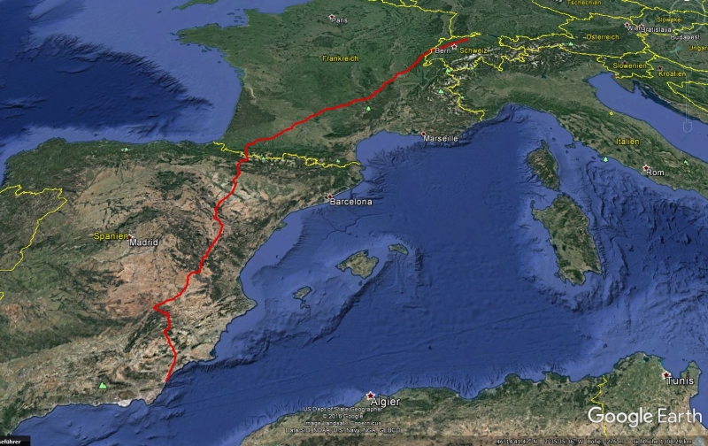 Die geplante Strecke verläuft vorerst ungefähr in nördlicher Richtung. Nach dem Start in Mojacar werde ich unter anderem an Saragossa vorbeikommen. Die Pyrenäen überquere ich diesmal am westlichen Ende über den Col du Somport. Danach geht es fast ausschliesslich in nordöstlicher Richtung weiter. Nördlich an Toulouse vorbei nach Lyon, bevor ich dann in der Gegend von Pontarlier über den Jura in die Schweiz gelange.