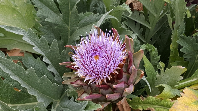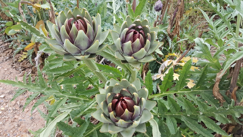 Zu meinem Erschrecken, waren da kaum Blüten anzutreffen. Von Schilderungen anderer Kollegen im Hotel, hatte ich erwartet, hier ein blühendes Feld zu sehen. Statt dessen fand ich viele grosse, teils halb geöffnete Artischocken. Sucht man in Wikipedia nach der Artischocke, so wird sie zwar als Nahrungsmittel, für bestimmte Situationen auch als Heilpflanze beschrieben. Es wird beiläufig erwähnt, dass sie zwar violett blühen würde, wenn sich nicht geerntet wird, aber nicht wofür sie sich blühend eignet. Ob da vielleicht Gärtnereien die Blume gerne als Dekomaterial verwenden?
