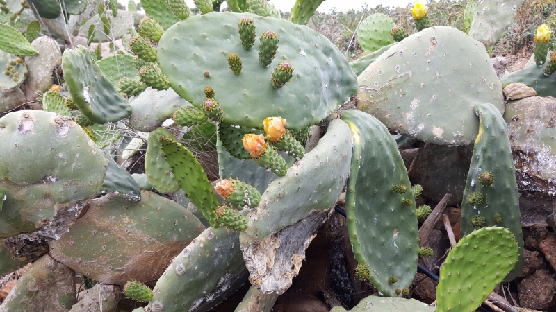 Ganz in der Nähe befinden sich auch teils riesengrosse Gebilde von Ohrenkakteen. Lange Zeit schien sich da kaum etwas zu verändern. Abgebrochene Teile lagen herum. Der Rest schien verdorrt, ausgetrocknet zu sein. Erst seit dem letzten Regen von vor ein paar Wochen, kam Leben in diese merkwürdigen, verholzten Gebilde. Überall trieben “ohrenförmige” runde Teile aus den Stämmen. Manchmal auch auf den Ohren selber, entstanden weitere Ohren. Vermutlich durch den Regen begünstigt entstanden jetzt auch Blüten.