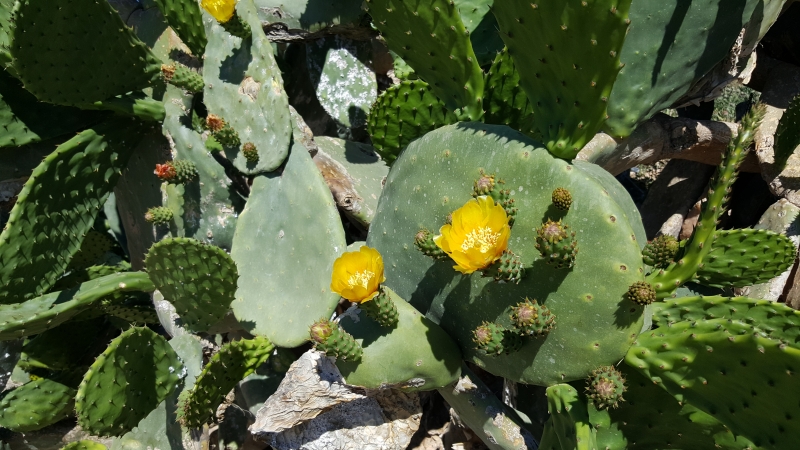 Offensichtlich blühen diese Kakteen nur kurze Zeit. Denn es waren auch heute nur wenige der Blüten wirklich offen, während viele andere schon verblüht waren, oder ihre Farben noch gar nicht entfalten konnten. Doch gleich neben den Kakteen steht ja das Feld mit den Artischocken: