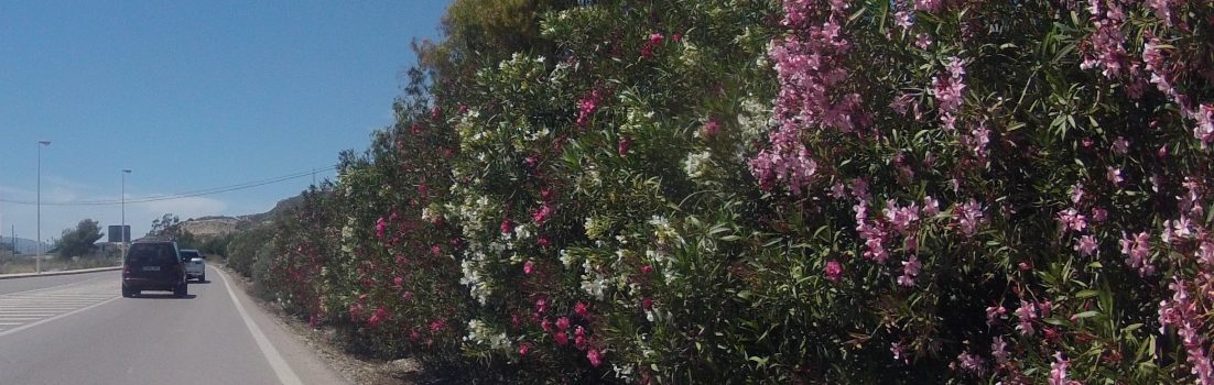 Nicht nur auf der Küstenstrasse gibt es mittlerweile sehr schöne Passagen, mit vielen blühenden Oleandersträuchern. Auch über Land, dort halt mehr als einzelner Strauch, blüht er jetzt sehr schön. Häufig in rot, manchmal auch weiss oder sogar in pink, habe ich schon Sträucher entdeckt.