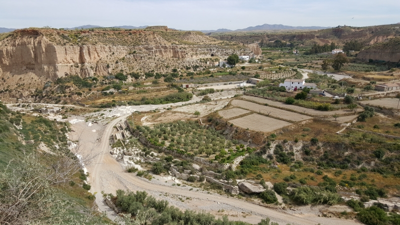 Der Weg dort hinauf ist nicht ganz einfach. Wir wollten mit den Rennrädern hinauf, mussten auch deshalb einen kleinen Umweg fahren. Um nicht von Anfang an alle unsere Kraft in “unnützen” Höhenmetern zu verbrauchen, wählten wir eine etwas flachere, aber längere Anfahrt, und kamen so unter anderem bei Sorbas vorbei. Ein schöner Aussichtspunkt auf das Bachbett des Rio Aguas belohnte fürs erste unsere Anstrengungen.