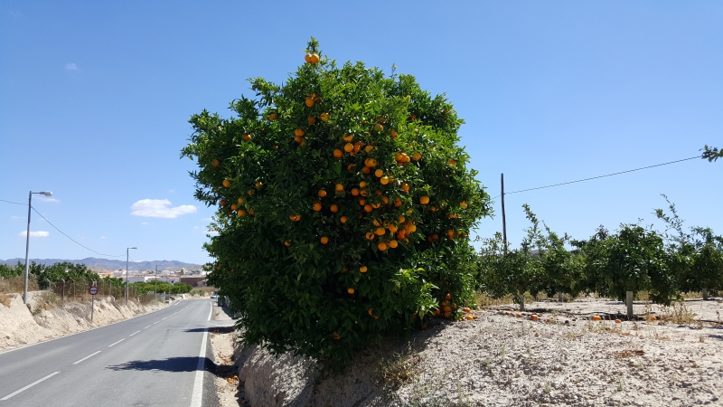 Ich werde vom Rückenwind angenehm gestossen. Die Fahrt fühlt sich einfach an. Einige Hügelchen, Autobahnüberfahrten, in die Hügel eingeschnittene Furchen gleiten unter meinen Rädern durch. Endlich auch mal ein Foto machen, von diesem Orangenbaum, so dicht an der Strasse und mit so merkwürdig vielen Orangen daran, die noch immer nicht abgelesen wurden.