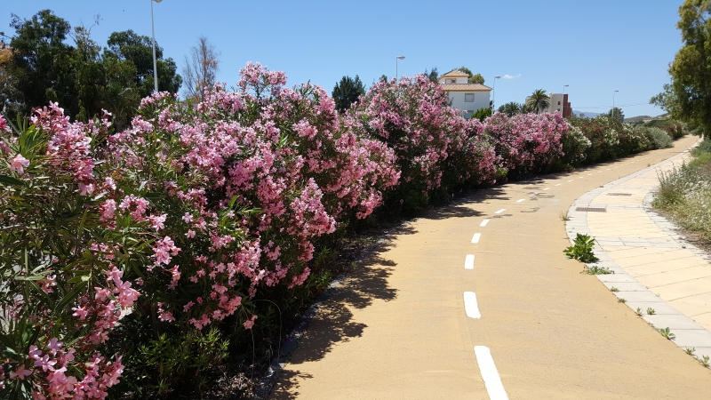 Ich verweile etwas in Cuevas del Almanzora. Biege dann auf die Schnellstrasse, verlasse dies aber bald wieder und komme nach Palomeras. Dort, wo entlang der Strasse so viele blühende Oleanderbüsche stehen.