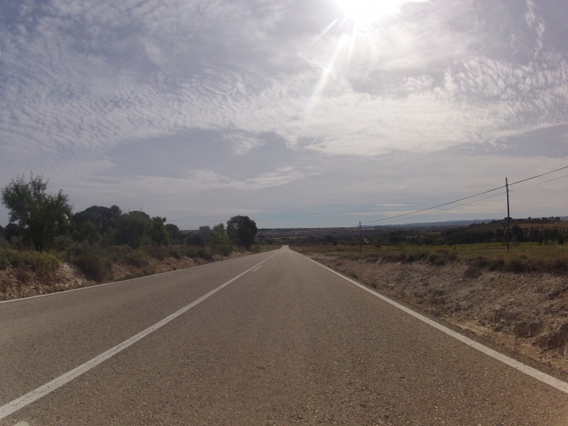 Es dauerte eine Weile bis sich mein GPS in den teils engen Gassen der Altstadt von Albacete wieder zurechtfand. Aber nach ein paar riesengrossen Kreiseln, ein paar Kilometern auf einer Schnellstrasse, fand ich dann doch den richtigen Weg. Vermutlich die ehemalige Hauptstrasse neben der Schnellstrasse, heute als Radweg markiert. 20 KM einigermassen flach, windstill, zwischen Getreidefeldern und ein paar Feldern mit Rebenstöcken hindurch. Da waren auch wieder andere Radfahrer auf ihrer Trainingsfahrt unterwegs.