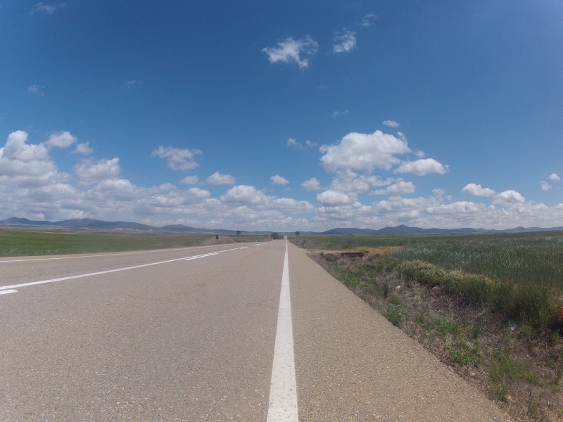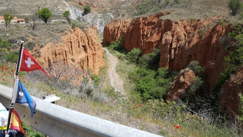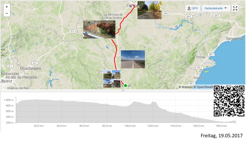 Ich fand während der Planung der Etappe nach gut 100 KM kein Hotel, das mir passte. Dann realisierte ich, dass es viel bergab gehen würde und versuchte es mal. Glück hatte ich, dass sich der Wind erst während der letzten 20 KM vor Zaragoza als Gegenwind bemerkbar machte. Es hätte sonst ein schöner Chrampf werden können. Glück war auch, dass es in Teruel bereits ab 7 Uhr ein sehr gutes und reichhaltiges Frühstücksbuffet gegeben hat, da hatte ich wenigstens eine ganze Weile keine Probleme mehr mit Nachschub. Die Notportion aus dem Anhänger reichte noch.