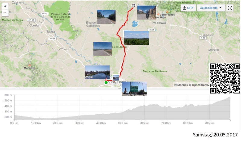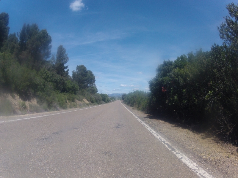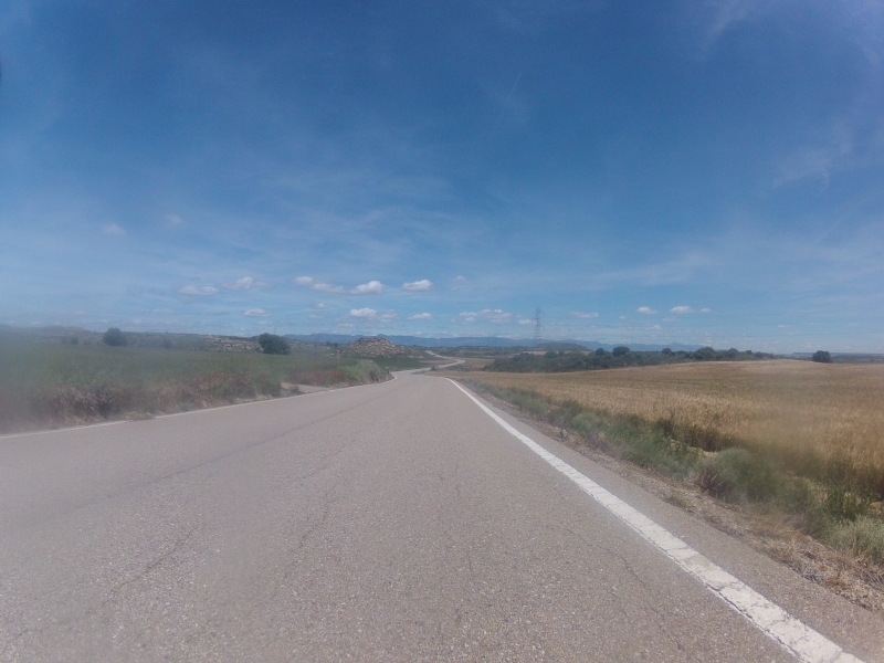 Kurz nach Zaragoza begann die Strasse anfänglich fast unmerklich zu steigen. Mit der Zeit wurden die Rampen über die Hügelchen aber immer heftiger. Auf einem der höheren Hügel hatte ich dann aber einen schönen Blick nach Norden, hin zu den Pyrenäen.