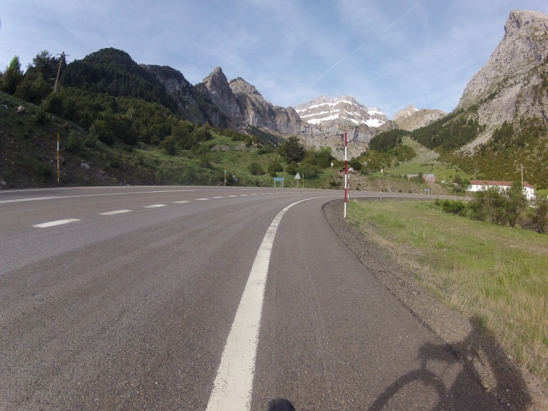 Als ich vom Hotel wegfuhr, würde es wohl noch eine Weile dauern, bis die Sonnenstrahlen durch das schmale Tal herunterkämen. Dennoch verzichtete ich auf wärmende Sachen, denn der Weg ging von allem Anfang an mit 8% in die Höhe, und somit auch an die Sonne. Es wurde rasch wärmer. Es war nicht mehr weit, von 1200 auf 1600 Meter über Meer, ein paar langgezogene Spitzkehren, das Tal öffnete sich auch bald und gab den Blick frei auf die umliegenden Berge.
