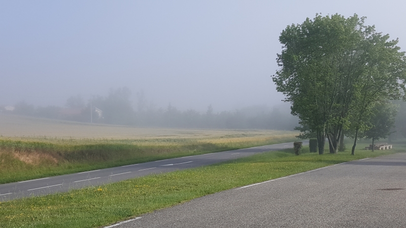 In Mauvezin, meiner Übernachtungsgelegenheit von gestern, strahlte die Sonne schon von Beginn des Tages weg. Doch Mauvezin befindet sich auf einem Hügel. Nur wenige Kilometer nach meiner Wegfahrt senkte sich die Strasse ins Tal hinunter.