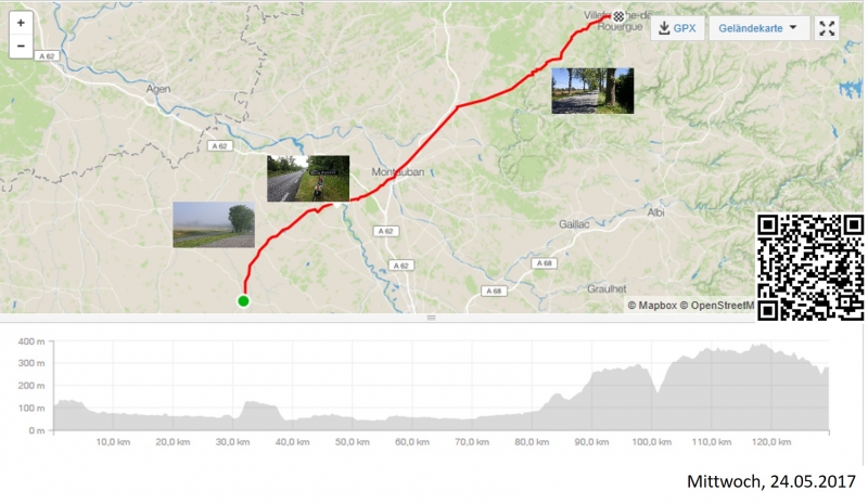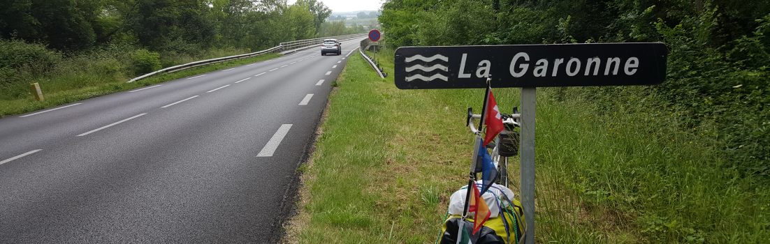 Wahrscheinlich dürften beide Orte kaum jemandem bekannt sein. Ich habe nun Toulouse weit nördlich passiert und im wesentlichen das Tal der Garonne überquert. Auch das ging natürlich nicht ganz ohne Hügel und Rampen, doch die ersten etwa 80 Kilometer waren recht flach, mit einer Ausnahme, der Einfahrt ins Tal der Garonne hinunter.