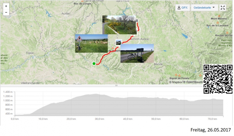 Immer wieder wurde entlang der Strasse die Ortschaft, oder die “Station” Aubrac erwähnt. Einige Ortschaften in der Gegend tragen denn auch den Zusatz Aubrac. Um die Passhöhe herum, waren viele Wohnmobile parkiert. Dazu wurden offensichtlich die Wiesen gemäht. In den nächsten Tagen, muss allerdings eine Gebühr für das Parkieren bezahlt werden. Während der Durchfahrt bin ich nicht wirklich drausgekommen, was da abläuft. Beim Schreiben dieses Postings habe ich dann im Internet einen Artikel aus dem Jahre 2016 über Pfingstgebräuche, Almauftrieb und den Pfingst-Ochsen von Aubrac (Midi-Pyrenäen) gefunden. Da läuft vermutlich in den nächsten Tagen ein grösseres Fest ab.