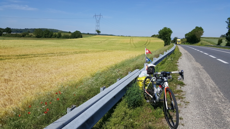 Vor dem zweiten, etwas steileren Anstieg bei etwa 60 KM der heutigen Strecke, verzehrte ich mein Sandwich, welches ich unterwegs eingekauft hatte. Die dann folgenden 100 Höhenmeter waren zwar spürbar, führten aber fast ausschliesslich durch einen Wald in die Höhe.