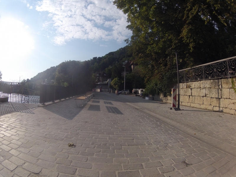 Für die Fahrt durch Wettingen wollte ich der Rushour etwas ausweichen. Ich fuhr meist etwas hinten durch und gelangte deshalb auch nach Ennetbaden hinunter. Das Bäderquartier hatte ich noch aus früheren Zeiten als ewige Baustelle in der Erinnerung. Fertig gebaut und renoviert ist der Durchgang zwar noch nicht ganz. Aber immerhin ein fahrbarer Grund, aus groben Kopfsteinen. Allerdings, wenigstens für den Crosser, hält sich das Rütteln noch in Grenzen. Der Weg dürfte wohl eher dem Fussgängerpublikum Freude bereiten.