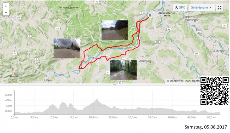 Zu den merkwürdigen Windverhältnissen von heute: Wahrscheinlich hatten wir einen Wind, der aus Nordwesten über den Bözberg ins Aaretal hinunter blies. Zwischen Wildegg und Schinznach-Bad verläuft die Aare in Süd-Nord-Richtung. Auf dem Hinweg hatte ich hier Rückenwind und auf dem Heimweg Gegenwind. Der hat dann auch die schwarze Wolke in südlicher Richtung weggedrängt. Teile des Windes folgten aber der Aare weiter abwärts nach Brugg. So kam es, dass ich auf dem Heimweg von Wildegg her zuerst im Gegenwind fuhr und etwa ab Schinznach-Bad hatte ich dann plötzlich Rückenwind. Klar, ich habe mich um knapp 90 Grad gedreht, der Wind aber auch, in dem er sich vom Habsburgerberg “umleiten” liess.